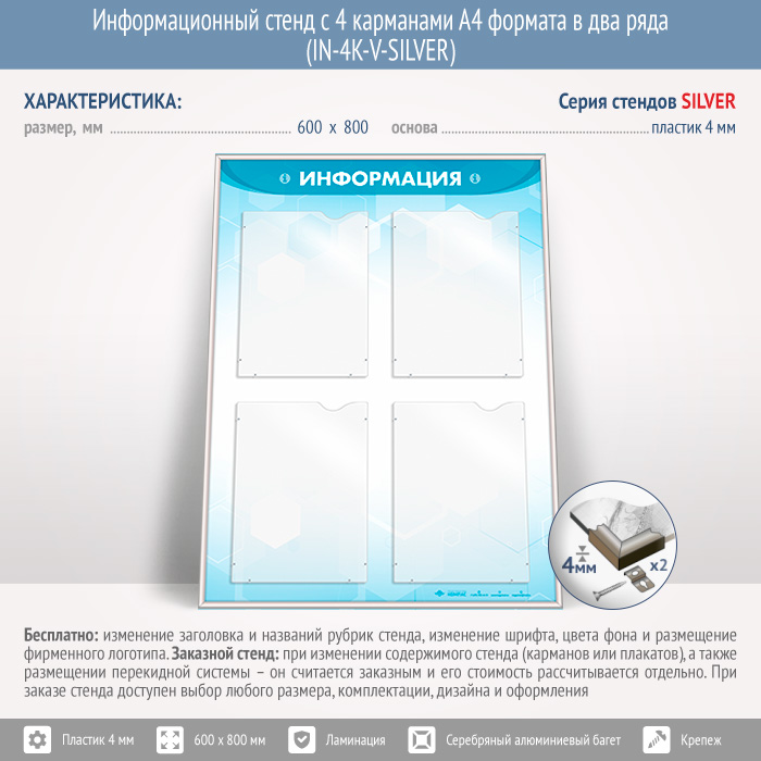 Информационный стенд с 4 карманами А4 формата в два ряда (IN-4K-V-SILVER) в Кызыле купить