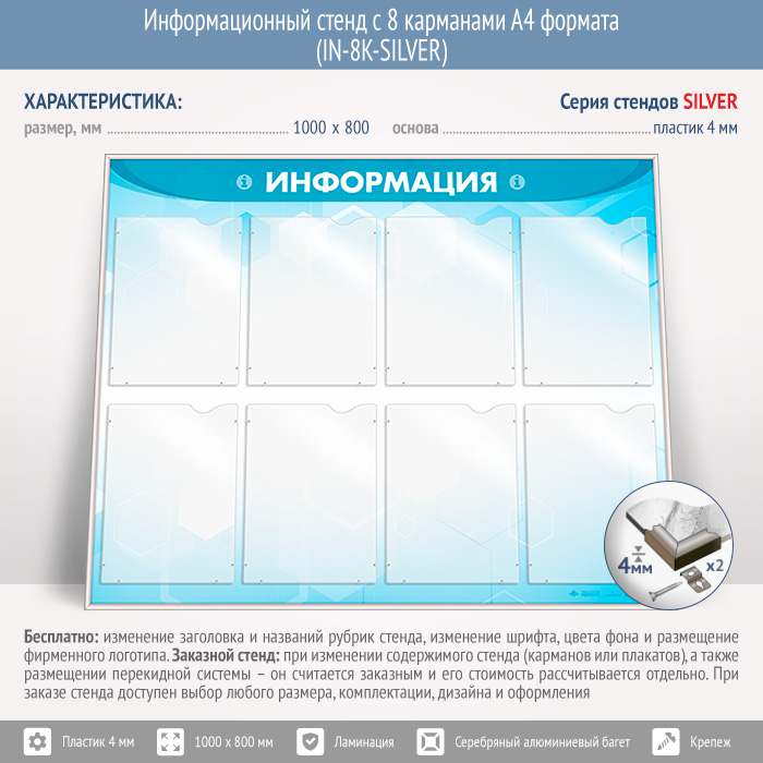 Информационный стенд с 8 карманами А4 формата (IN-8K-SILVER) в Кызыле купить