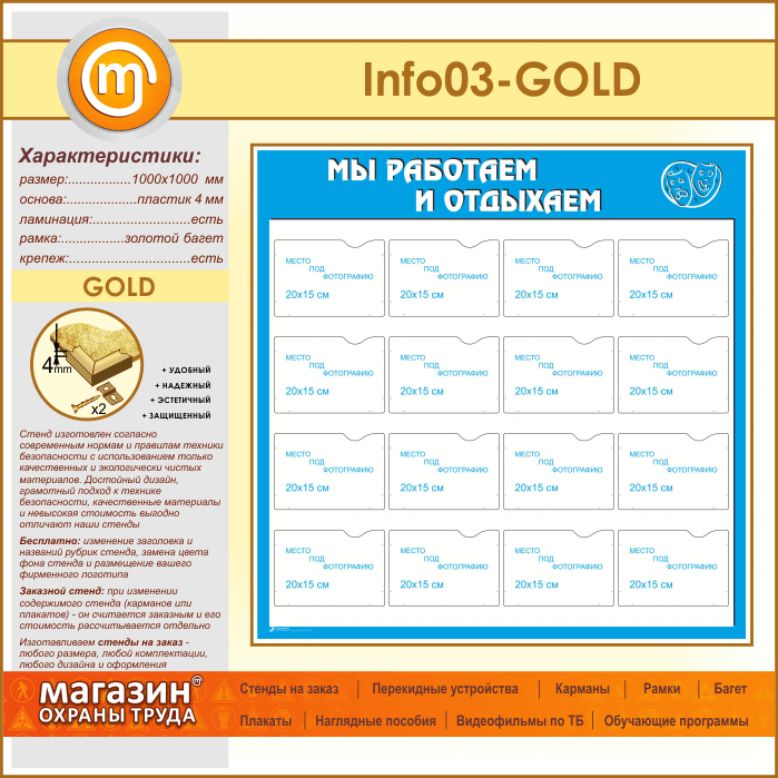 Стенд «Мы работаем и отдыхаем» с 16 карманами А5 формата (IN-03-GOLD) в Кызыле купить