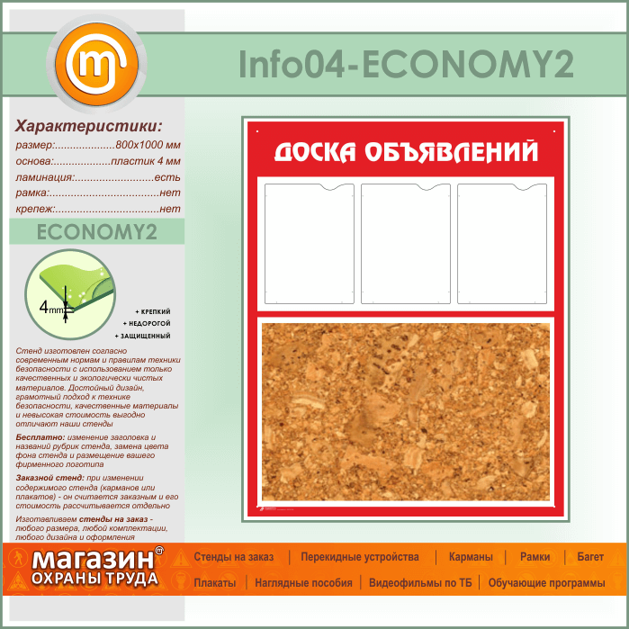 Стенд «Доска объявлений» с пробковым полотном и 3 карманами А4 формата (IN-04-ECONOMY2) в Кызыле купить