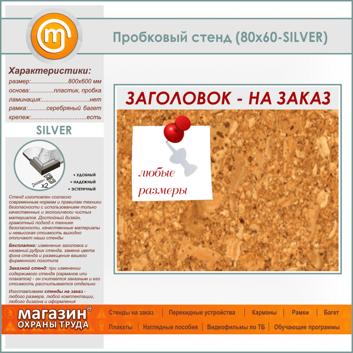 Пробковая доска с заголовком, 80х60 см (IN-06-SILVER) в Кызыле купить