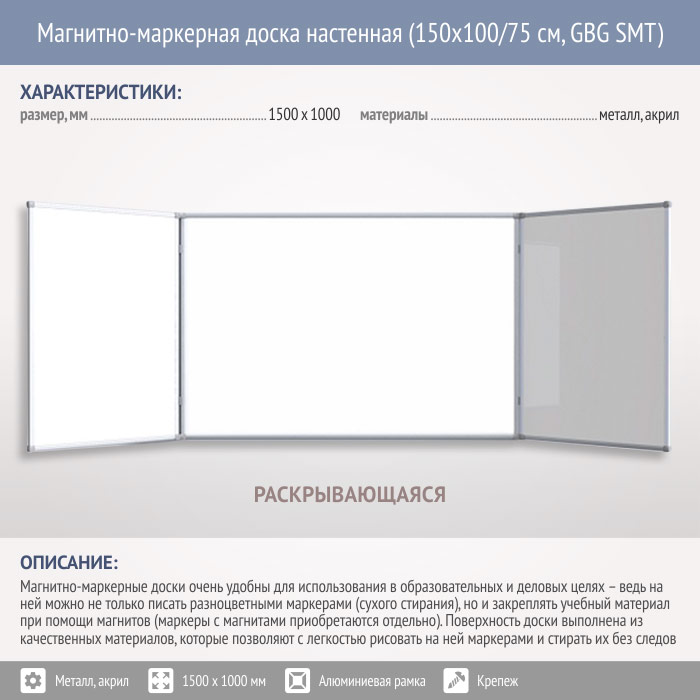 Магнитно-маркерная доска настенная (150x100/75 см, GBG SMT) в Кызыле купить