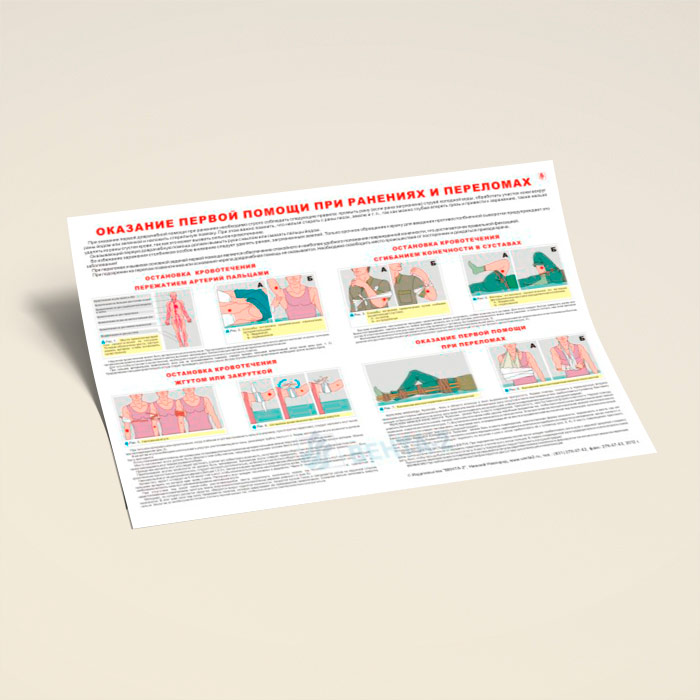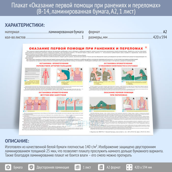 Плакат «Оказание первой помощи при ранениях и переломах» (В-14, ламинированная бумага, А2, 1 лист) в Кызыле купить