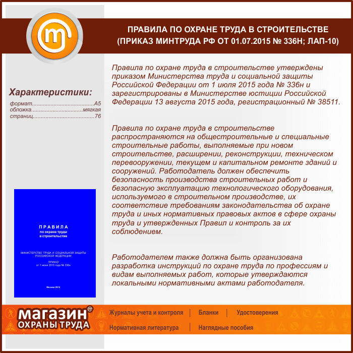 Правила по охране труда в строительстве (Приказ Минтруда РФ от 01.07.2015 № 336н) (ЛАП-10) в Кызыле купить