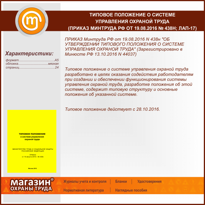Типовое положение о системе управления охраной труда (Приказ Минтруда РФ от 19.08.2016 № 438н) (ЛАП-17) в Кызыле купить