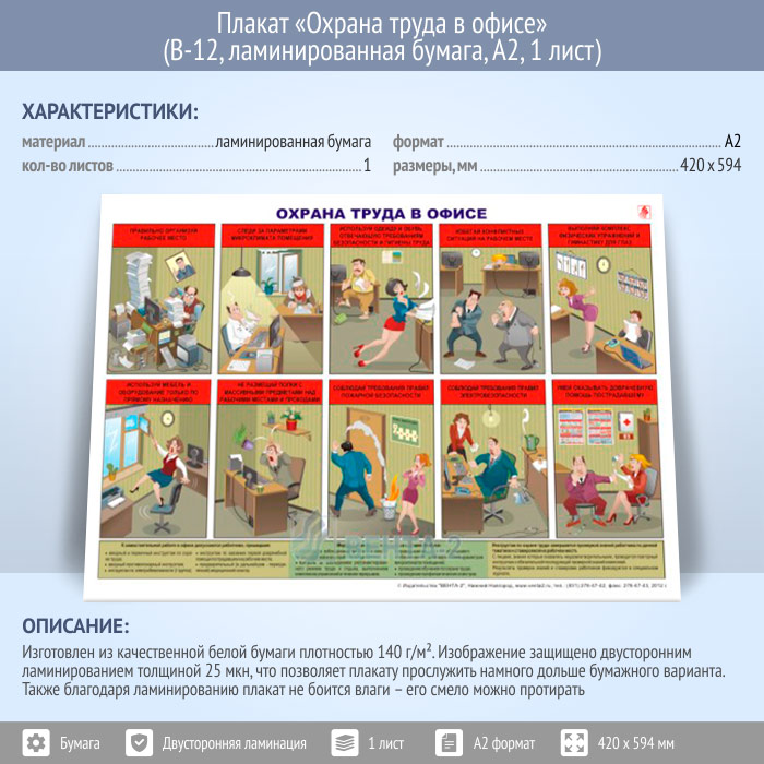 Плакат «Охрана труда в офисе» (В-12, ламинированная бумага, А2, 1 лист) в Кызыле купить