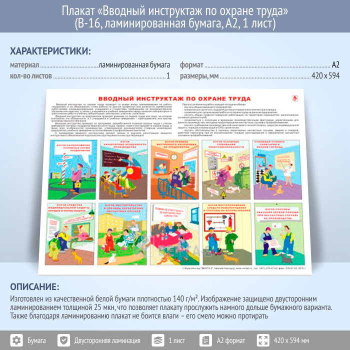 Плакат «Вводный инструктаж по охране труда» (В-16, ламинированная бумага, А2, 1 лист) в Кызыле купить