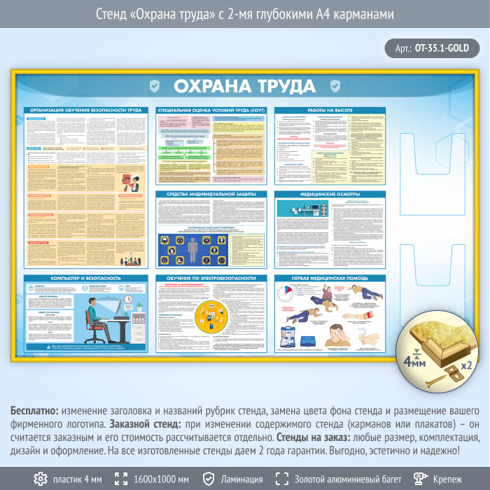 Стенд «Охрана труда» с 2-мя глубокими А4 карманами (OT-35.1-GOLD) в Кызыле купить