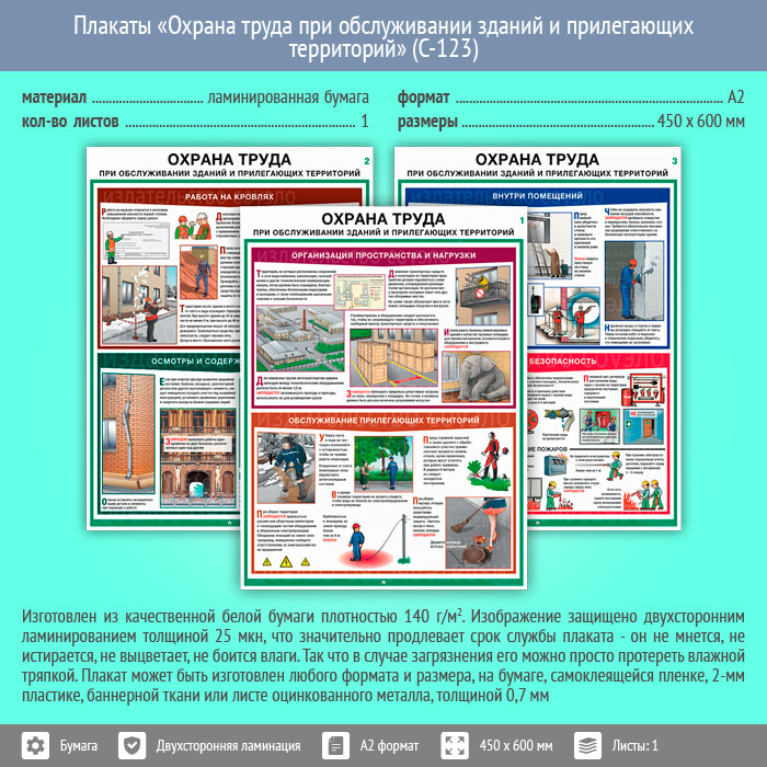 Плакаты «Охрана труда при обслуживании зданий и прилегающих территорий» (С-123, ламинированная бумага, А2, 3 листа) в Кызыле купить