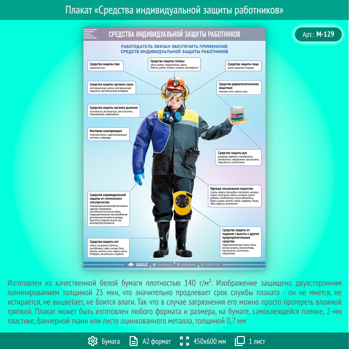 Плакат «Средства индивидуальной защиты работников» (М-129, ламинированная бумага, А2, 1 лист) в Кызыле купить