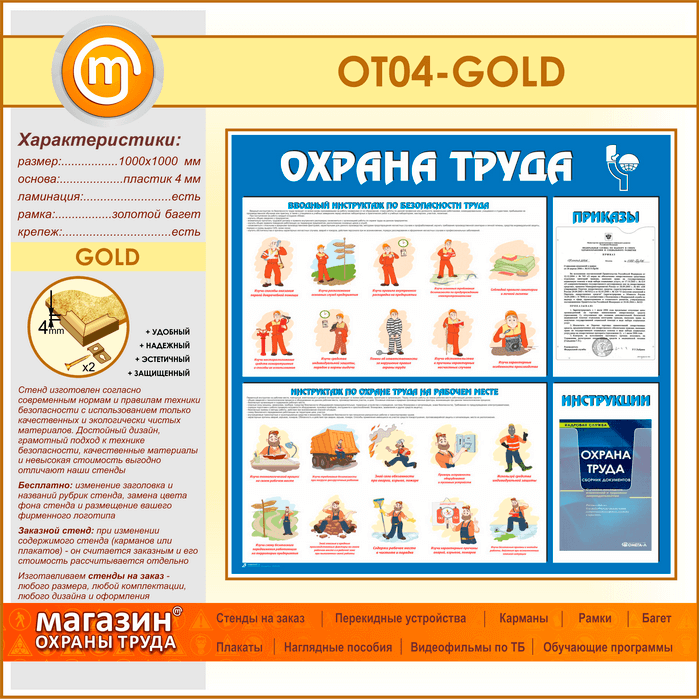Стенд «Охрана труда» с плоским и объемным карманами (OT-04-GOLD) в Кызыле купить