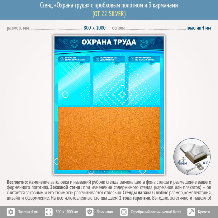Стенд «Охрана труда» с пробковым полотном и 3 карманами (OT-22-SILVER) в Кызыле купить