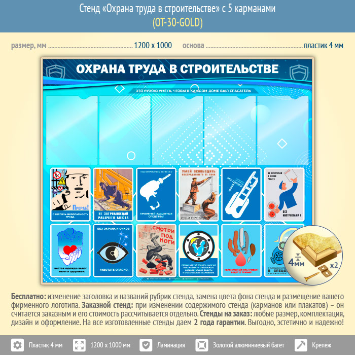 Стенд «Охрана труда в строительстве» с 5 карманами (OT-30-GOLD) в Кызыле купить