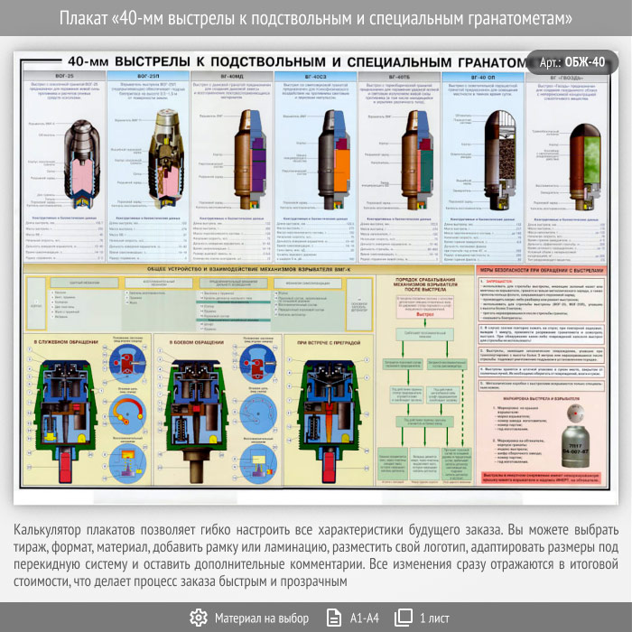 Плакат «40-мм выстрелы к подствольным и специальным гранатометам» (ОБЖ-40, 1 лист) в Кызыле купить