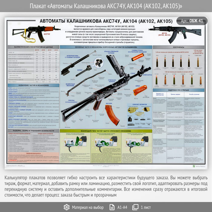 Плакат «Автоматы Калашникова АКС74У, АК104 (АК102, АК105)» (ОБЖ-41, 1 лист) в Кызыле купить