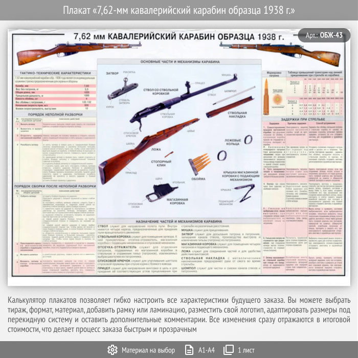 Плакат «7,62-мм кавалерийский карабин образца 1938 г.» (ОБЖ-43, 1 лист) в Кызыле купить