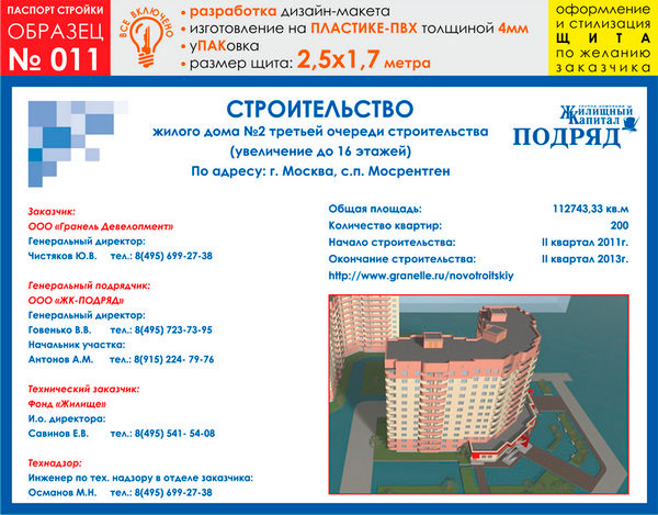 Паспорт стройки, образец № 11 (пластик 4 мм, 2500х1700 cм) в Кызыле купить