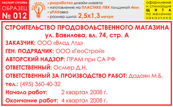 Паспорт стройки, образец № 12 (пластик 4 мм, 2500х1300 cм) в Кызыле купить