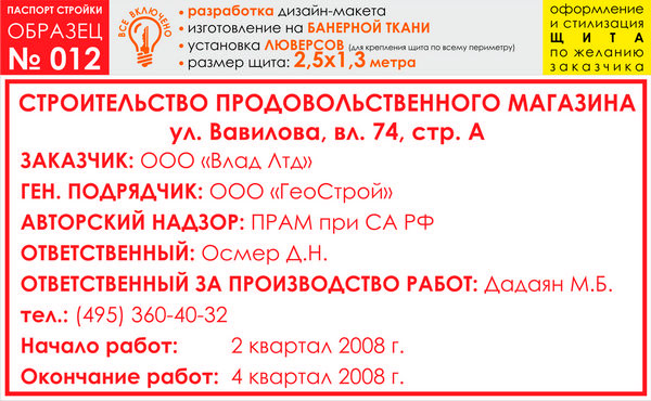 Паспорт стройки, образец № 12 (баннерная ткань, 2500х1300 cм) в Кызыле купить