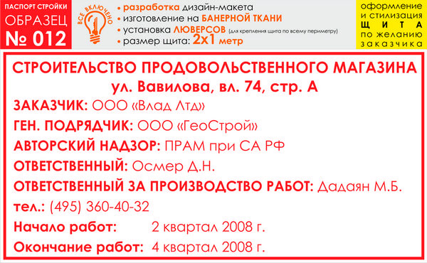 Паспорт стройки, образец № 12 (баннерная ткань, 2000х1000 cм) в Кызыле купить