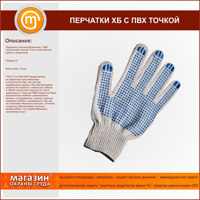 Применяются на сборочных производствах, в строительстве, при ручном перемещении грузов. Они обеспечивают защиту от порезов и небольших ударов, а также частичную защиту от сухих загрязнений. Точечное ПВХ-покрытие дает возможность надежно захватывать детали, инструменты, технику. Данные перчатки удобны в применении, так как не стесняют движений пальцев