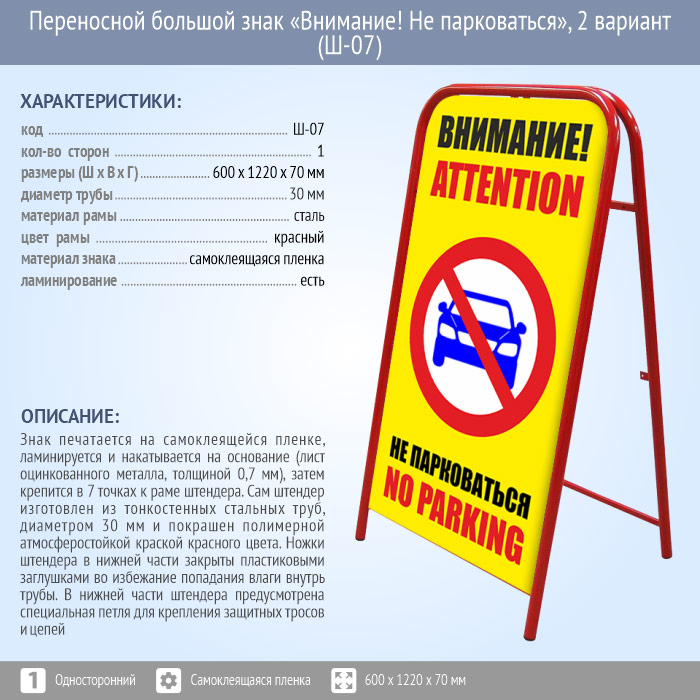 Переносной большой знак «Внимание! Не парковаться», 2 вариант (Ш-07, односторонний, самокл. пленка)