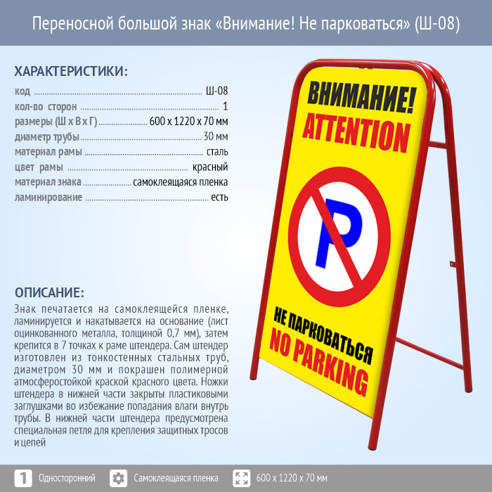 Переносной большой знак «Внимание! Не парковаться» (Ш-08, односторонний, самокл. пленка)