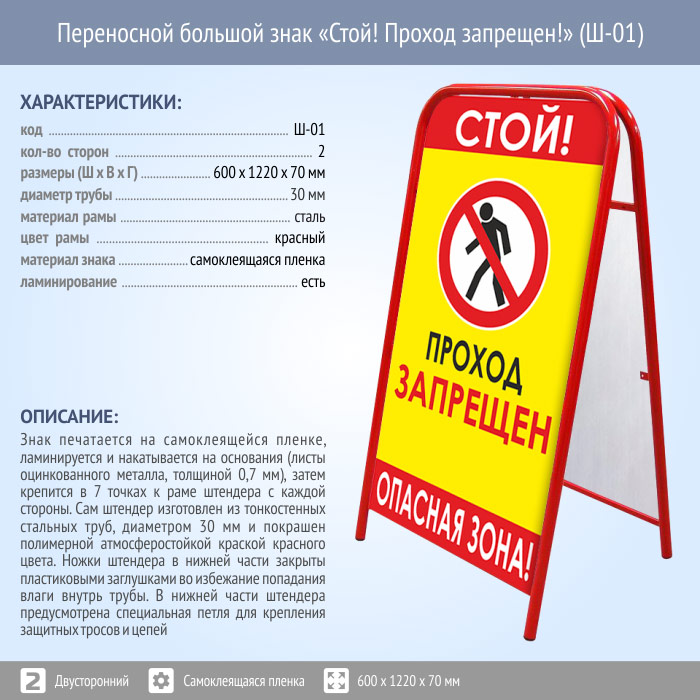 Переносной большой знак «Стой! Проход запрещен!» (Ш-01, двусторонний, самоклеящаяся пленка) в Кызыле купить