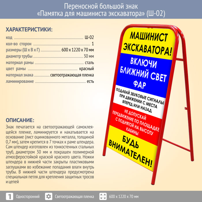 Переносной большой знак «Памятка для машиниста экскаватора» (Ш-02, односторонний, светоотражающая пленка) в Кызыле купить