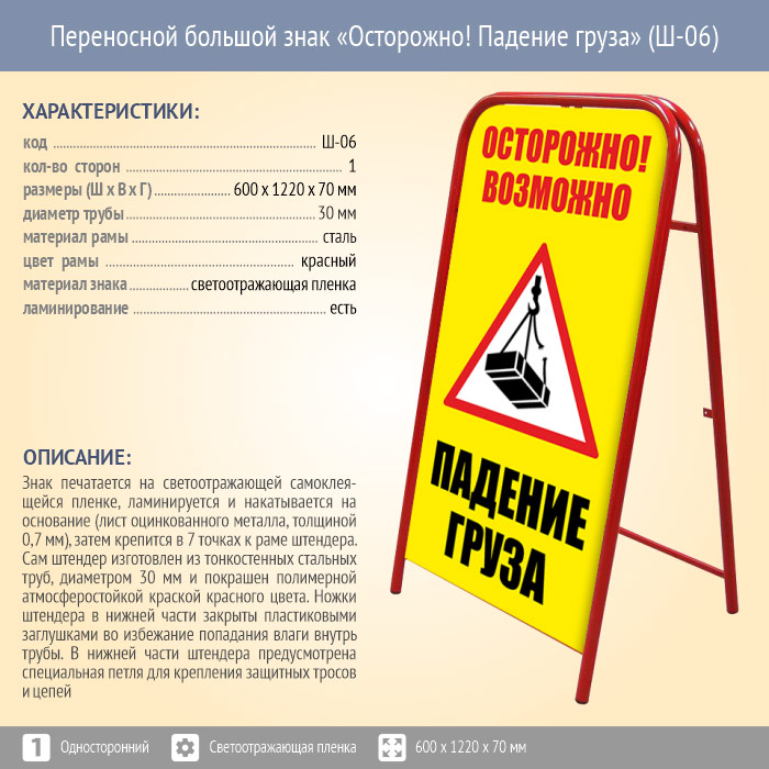 Переносной большой знак «Осторожно! Падение груза» (Ш-06, односторонний, светоотражающая пленка) в Кызыле купить