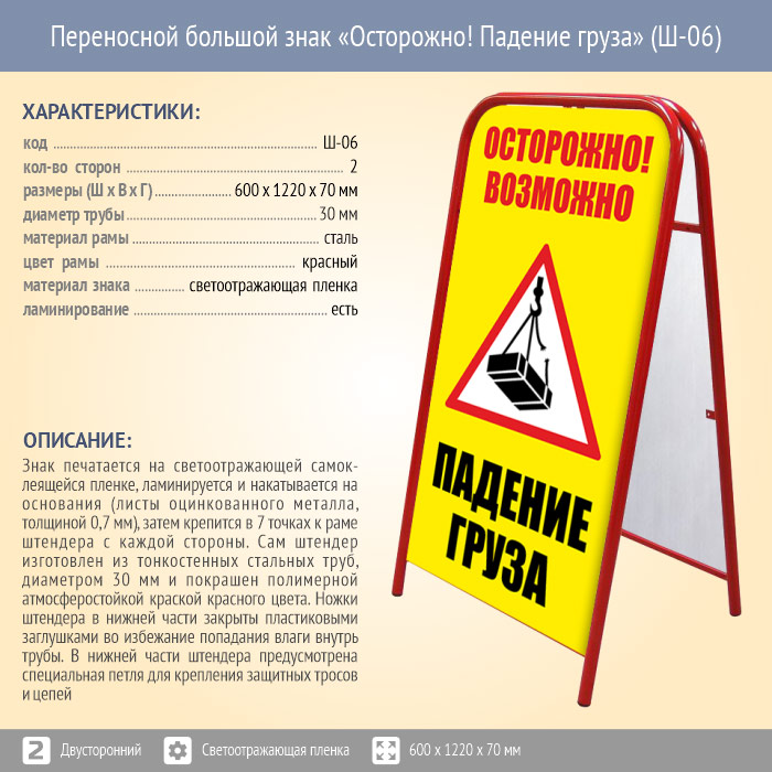 Переносной большой знак «Осторожно! Падение груза» (Ш-06, двусторонний, светоотражающая пленка) в Кызыле купить