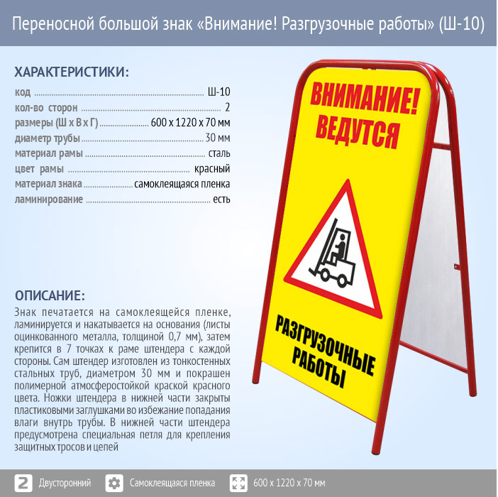 Переносной большой знак «Внимание! Разгрузочные работы» (Ш-10, двусторонний, самоклеящаяся пленка) в Кызыле купить