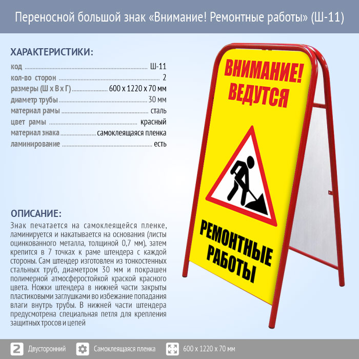 Переносной большой знак «Внимание! Ремонтные работы» (Ш-11, двусторонний, самоклеящаяся пленка) в Кызыле купить