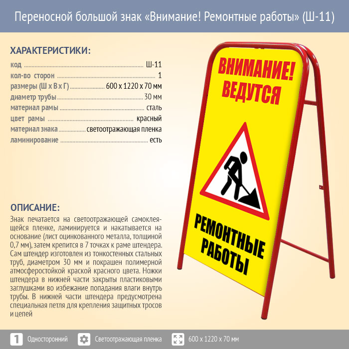 Переносной большой знак «Внимание! Ремонтные работы» (Ш-11, односторонний, светоотражающая пленка) в Кызыле купить