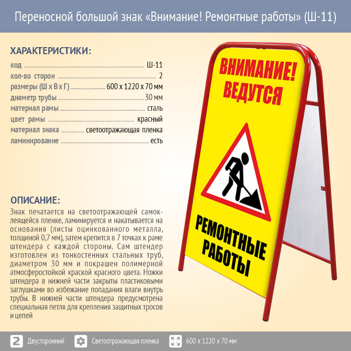Переносной большой знак «Внимание! Ремонтные работы» (Ш-11, двусторонний, светоотражающая пленка) в Кызыле купить