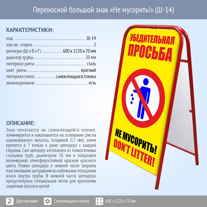 Переносной большой знак «Не мусорить!» (Ш-14, двусторонний, самоклеящаяся пленка) в Кызыле купить