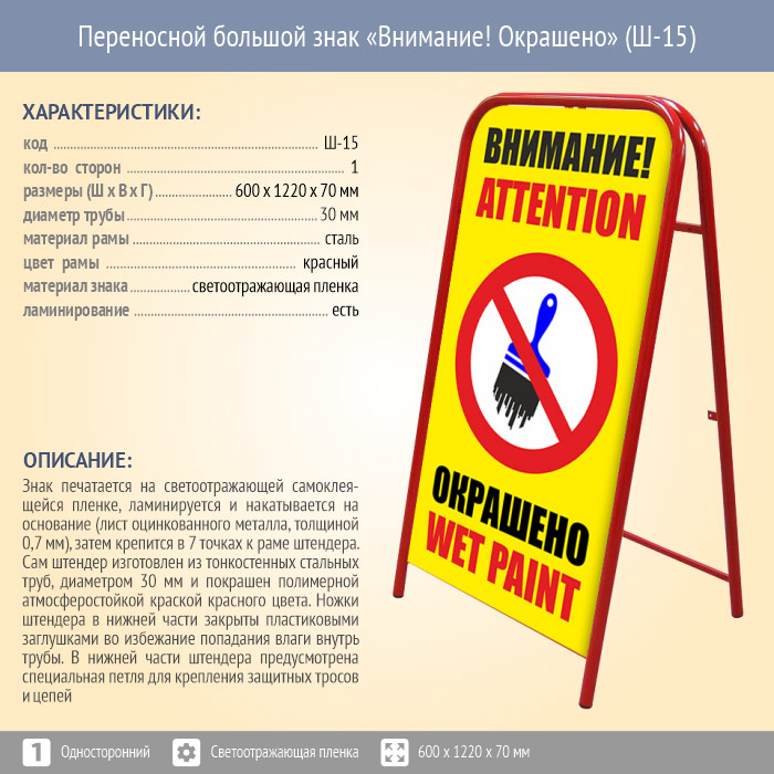 Переносной большой знак «Внимание! Окрашено» (Ш-15, односторонний, светоотражающая пленка) в Кызыле купить