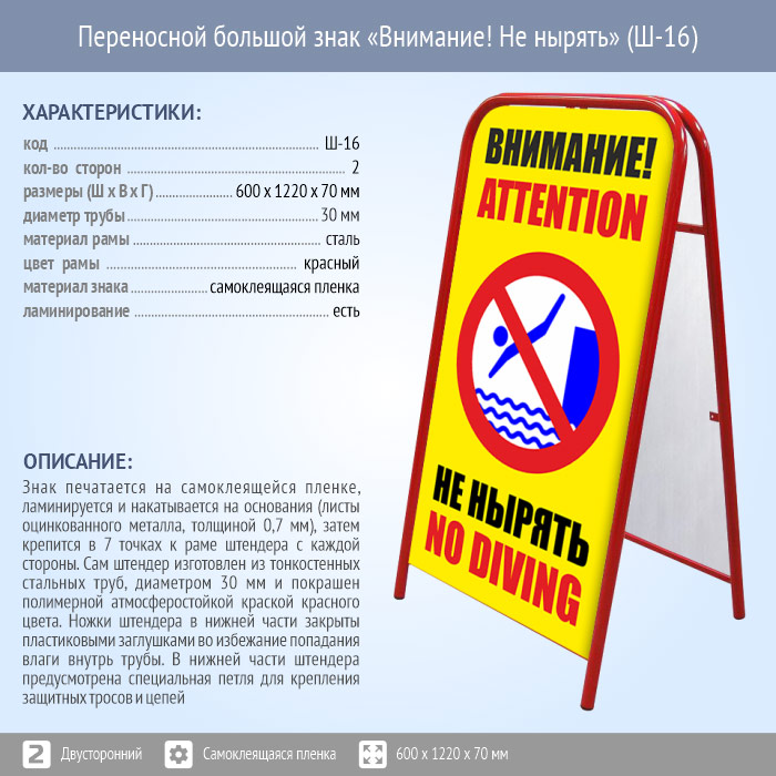 Переносной большой знак «Внимание! Не нырять» (Ш-16, двусторонний, самоклеящаяся пленка) в Кызыле купить