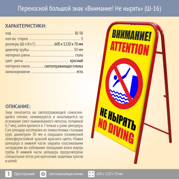 Переносной большой знак «Внимание! Не нырять» (Ш-16, односторонний, светоотражающая пленка) в Кызыле купить