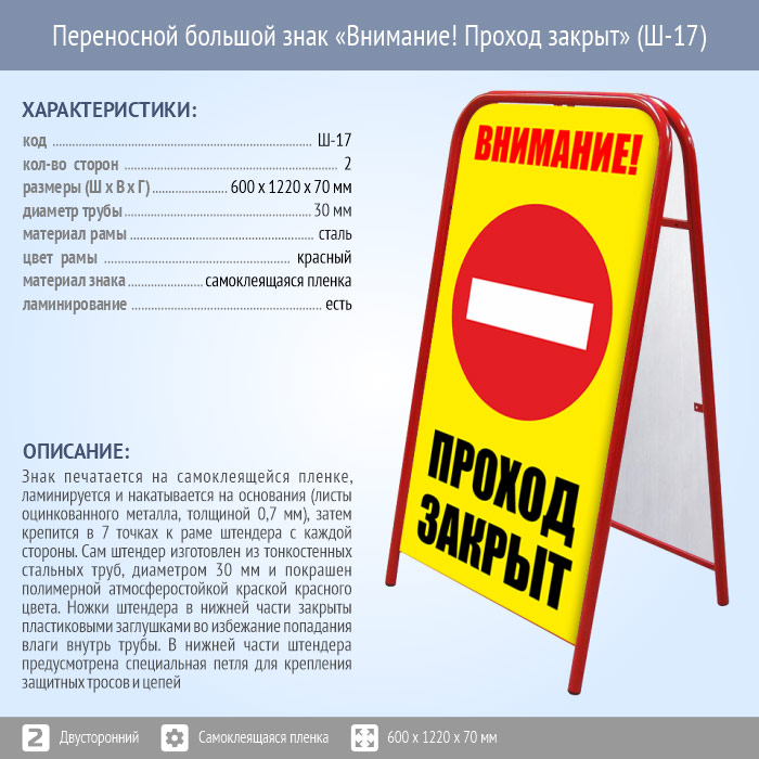 Переносной большой знак «Внимание! Проход закрыт» (Ш-17, двусторонний, самоклеящаяся пленка) в Кызыле купить