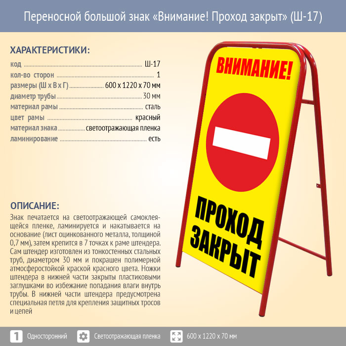 Переносной большой знак «Внимание! Проход закрыт» (Ш-17, односторонний, светоотражающая пленка) в Кызыле купить