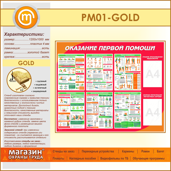 Стенд «Оказание первой помощи» с плоским и объемным карманами (PM-01-GOLD) в Кызыле купить