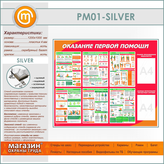 Стенд «Оказание первой помощи» с плоским и объемным карманами (PM-01-SILVER) в Кызыле купить
