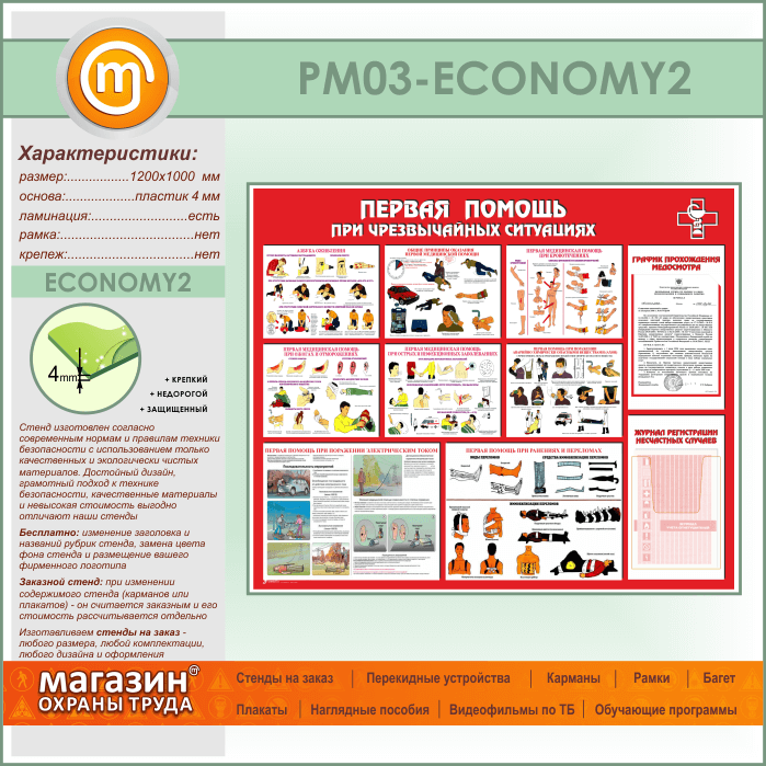 Стенд «Первая помощь при чрезвычайных ситуациях» с плоским и объемным карманами (PM-03-ECONOMY2) в Кызыле купить