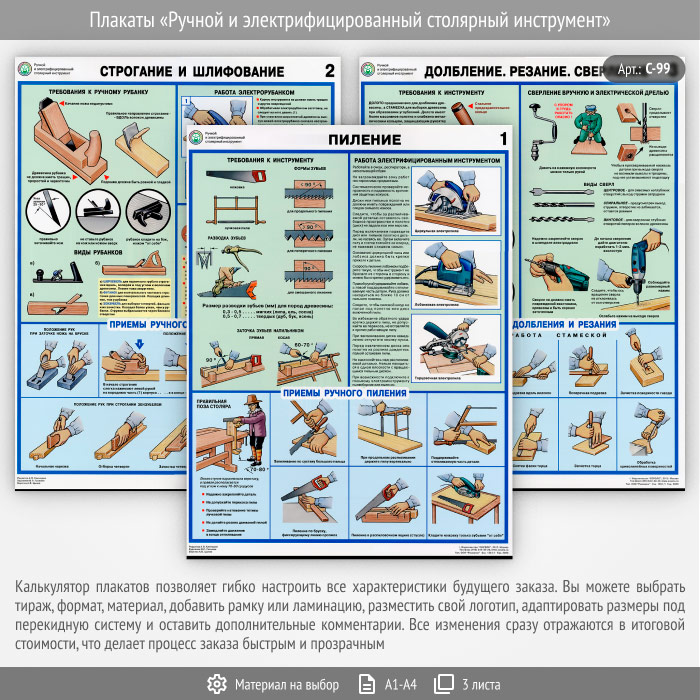 Плакаты «Ручной и электрифицированный столярный инструмент» (С-99, ламинир. бумага, А2, 3 листа)
