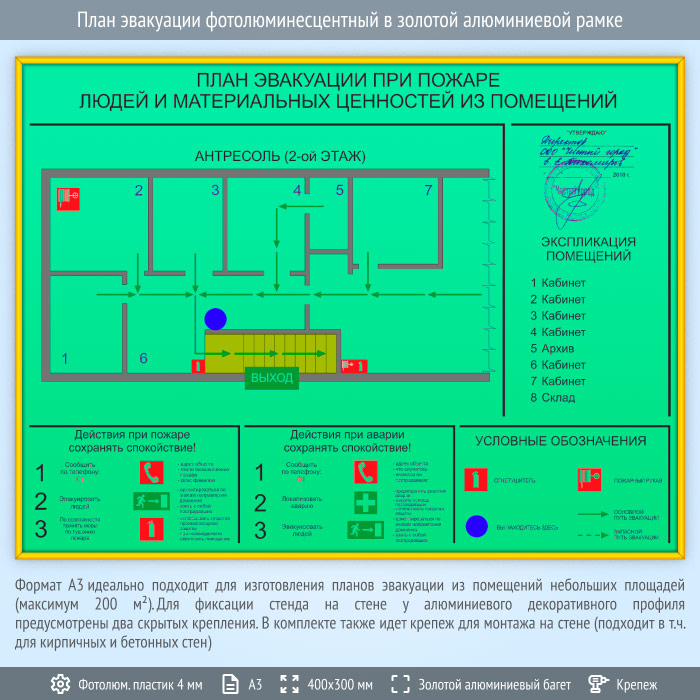 План эвакуации фотолюминесцентный в золотой алюминиевой рамке (А3 формат) в Кызыле купить