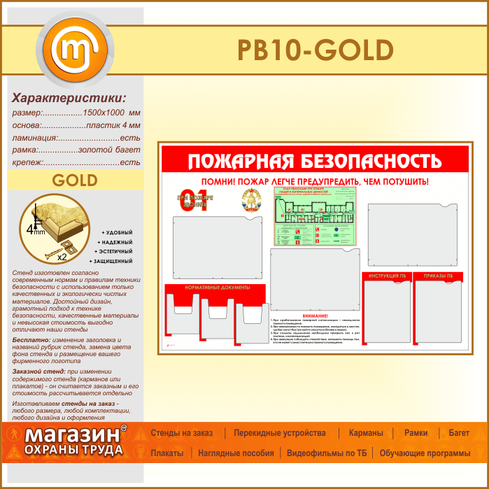 Стенд «Пожарная безопасность» с планом эвакуации, 5 плоскими и 3 объемными карманами (PB-10-GOLD) в Кызыле купить