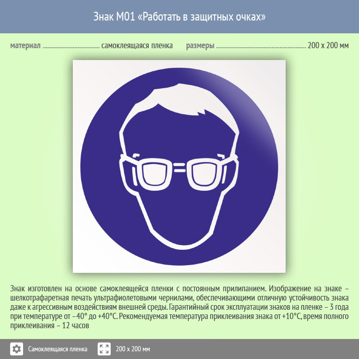Знак M01 «Работать в защитных очках» (пленка, 200х200 мм) в Кызыле купить