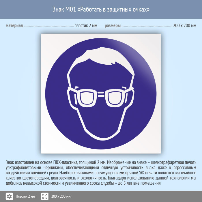 Знак M01 «Работать в защитных очках» (пластик, 200х200 мм) в Кызыле купить