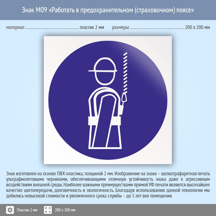 Знак M09 «Работать в предохранительном (страховочном) поясе» (пластик, 200х200 мм) в Кызыле купить
